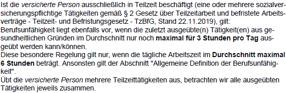 An sich würde jedoch - sofern diese m.E. sehr unklaren Voraussetzungen für eine Teilzeittätigkeit erfüllt sind - eine Berufsunfähigkeit vorliegen, wenn die versicherte Person ihre Teilzeittätigkeit, so wie sie ohne gesundheitliche Beeinträchtigung ausgestaltet war, weniger als drei Stunden pro Arbeitstag ausüben kann.