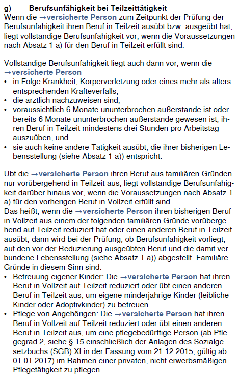 Keinen Mehrwert bietet diese Teilzeitklausel Versicherten, die aus familiären Gründen ihre Arbeitszeit reduziert haben beziehungsweise mussten. Hier hat die Rechtsprechung bereits für Klarheit zugunsten der Versicherten gesorgt (s. OLG Nürnberg, Urteil vom 30.11.2015, Az. 8 U 697/14).