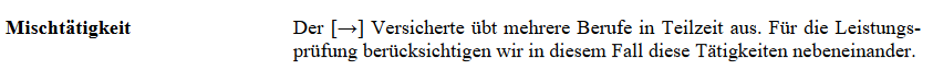 Stattdessen prüft die Alte Leipziger Lebensversicherung a.G. auch Mischtätigkeiten, zu denen explizit auch Tätigkeiten als Hausfrau / Hausmann, Schüler/in, Student/in oder Auszubildende/r zählen. Dadurch kann sich m.E. in Einzelfällen ein Mehrwert ergeben, etwa wenn neben der hauptberuflichen Teilzeittätigkeit Kindererziehung geleistet wird, da sich aus der Kombination ggf. ein größerer zeitlicher Umfang ergeben könnte als bei einer hauptberuflichen Vollzeittätigkeit. Damit wäre dann ggf. früher / leichter eine Berufsunfähigkeit vorliegend.