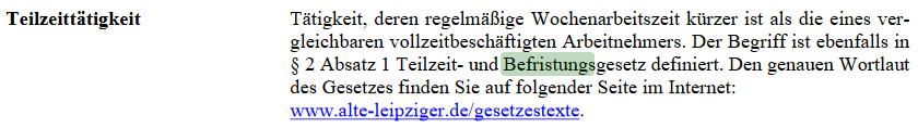 Zur Klärung, wann eine Teilzeittätigkeit vorliegt, stellt die Alte Leipziger auf §2 Absatz 1 des Teilzeit- und Befristungsgesetzes ab. Hier könnte angeführt werden, dass der Gesetzgeber seine Definition nachteilig abändern könnte. Allerdings schätze ich dieses Risiko als eher gering ein.