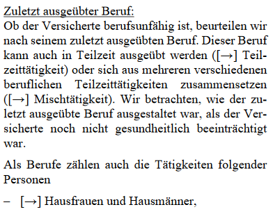 Gemäß § 172 (2) VVG ist berufsunfähig, "wer seinen zuletzt ausgeübten Beruf, so wie er ohne gesundheitliche Beeinträchtigung ausgestaltet war, infolge Krankheit, Körperverletzung oder mehr als altersentsprechendem Kräfteverfall ganz oder teilweise voraussichtlich auf Dauer nicht mehr ausüben kann.".