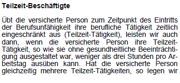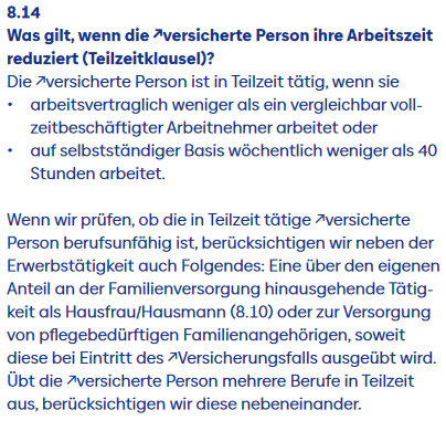 Diese Teilzeitklausel greift, sofern die versicherte Person arbeitsvertraglich oder auf selbstständiger Basis wöchentlich weniger als 30 Stunden arbeitet.