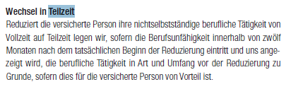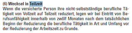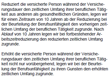 Reduziert die versicherte Person ihre berufliche Tätigkeit von Vollzeit auf Teilzeit, legt der Versicherer die berufliche Tätigkeit in Art und Umfang vor der Reduzierung der Arbeitszeit zugrunde, jedoch nur in den nächsten 12 Monaten ab Reduzierung. Offen bleibt m.E., ob dieser Zeitraum ab Vereinbarung der Reduzierung beginnt oder ab tatsächlicher Reduzierung.