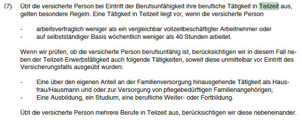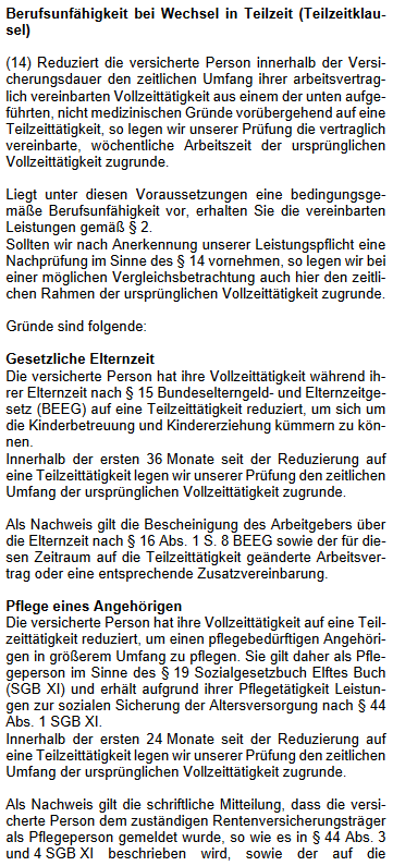 Im Grunde bietet diese Teilzeitklausel für kaum jemanden einen Mehrwert, wenn man bedenkt, dass die aktuelle Rechtsprechung ohnehin entschieden hat, dass bei versicherten Personen, die vorübergehend aus familiären Gründen auf Teilzeit reduzieren, die Prüfung auf Berufsunfähigkeit auf Vollzeittätigkeit zu erfolgen hat.