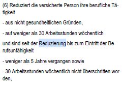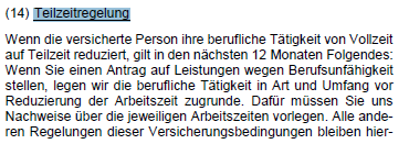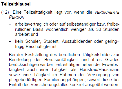 Festzuhalten ist hierbei, dass die Klausel ausschließlich greift, sofern die vertraglich fixierte wöchentliche Arbeitszeit während der Versicherungsdauer reduziert wird. Somit bietet die Klausel keinen Vorteil, wenn bereits bei Vertragsabschluss eine Teilzeittätigkeit vorlag - außer der Umfang der Tätigkeit wurde nach Vertragsabschluss und Eintritt der vermeintlichen Berufsunfähigkeit weiter reduziert.