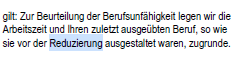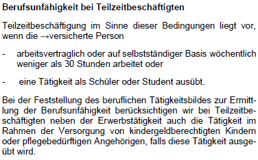 Gemäß Formulierung greift die Klausel, sofern die versicherte Person zum Zeitpunkt des Eintritts der Berufsunfähigkeit ihre berufliche Tätigkeit "zeitlich eingeschränkt" ausübt. Offen bleibt m.E. wann eine Tätigkeit als "zeitlich eingeschränkt" gilt.