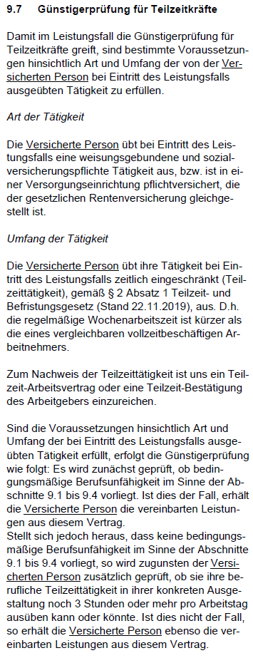 So muss die versicherte Person eine "weisungsgebundene und sozialversicherungspflichtige" Tätigkeit ausüben oder in einer Versorgungseinrichtung pflichtversichert sein, die der gesetzlichen Rentenversicherung gleichgestellt ist. Letzteres wäre m.E. etwa bei einer Pflichtmitgliedschaft in einem Versorgungswerk erfüllt. Es gibt jedoch auch andere Einschätzungen, dass Freiberufler von dieser Teilzeitklausel nicht erfasst werden, da diese nicht weisungsgebunden sind.